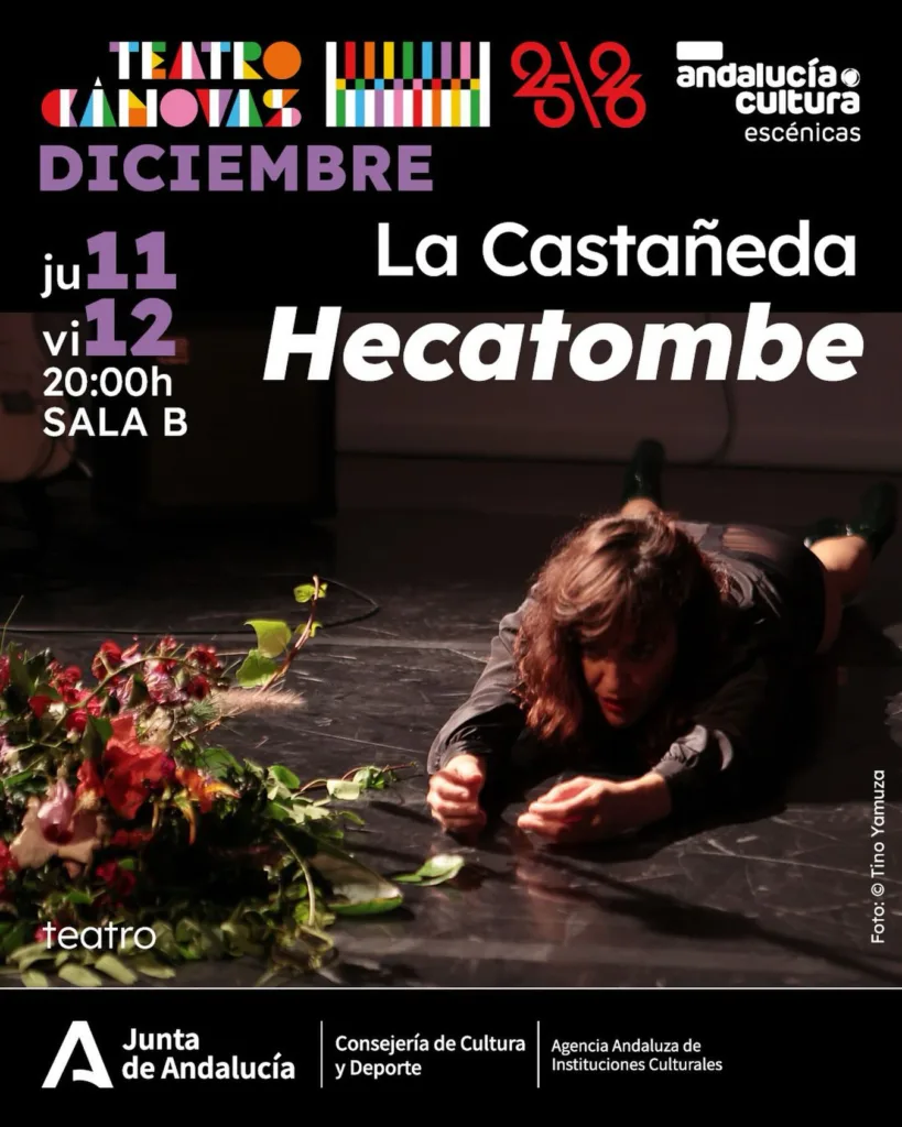 Crónica de Hecatombe, de María Castañeda enstafmagazine.com. 22 December 2025 | Texto: Marta A.H.. | Fotografía: Edu Rosa.Teatro Canovas. 12.12.25Hay obras que no buscan solo narrar algo, sino abrir una fisura, un pequeño temblor en la superficie cotidiana. Hecatombe pertenece a esa categoría de piezas que funcionan más como un proceso que como un relato: una invocación, un desgarro, una reconstrucción. Desde el inicio, María Castañeda propone un viaje que no se queda en lo anecdótico, sino que se adentra en los pliegues de la memoria y del cuerpo, como si ambas cosas fueran territorio indisoluble. El estreno tuvo lugar en la Sala B del Teatro Cánovas, un espacio íntimo, casi de laboratorio, que obliga al público a situarse muy cerca del centro de gravedad emocional de la obra. Y, sin embargo, se puede intuir que Hecatombe tiene una respiración más amplia, que su material, a la vez físico, poético y sonoro, pide crecer, expandirse, probarse en escenarios de mayor escala donde la amplitud espacial le permita desplegar su peso y su potencia.Castañeda, que firma e interpreta la obra, sostiene el espectáculo desde una presencia polifacética que es probablemente su rasgo más destacado. Su cuerpo y su voz funcionan como instrumentos que se afinan y desafinan a propósito: el canto emerge en momentos clave, como una grieta emocional y una forma de expresar. La expresión corporal es firme, matizada, a ratos arrebatada y a ratos contenida.Lo que hace de Hecatombe una experiencia particular es su manera de crecer. La obra empieza con una aparente calma, casi como si fuera un ritual preparatorio, pero poco a poco se adentra en zonas más profundas, más incómodas, más sensoriales. Ese avance in crescendo es uno de sus mayores aciertos: la pieza se va cargando de capas, de resonancias, de preguntas sin respuesta. Y es precisamente en ese aumento de intensidad donde la dramaturgia encuentra su mejor ritmo. El monólogo final actúa como un vértice emocional. No es simplemente un cierre narrativo, sino una condensación del viaje. Castañeda se queda casi desnuda de artificios, sosteniendo la palabra con una claridad y una vulnerabilidad que le dan sentido al trayecto que hemos presenciado. Es un momento que respira verdad, que deja un silencio lleno de electricidad en la sala. En conjunto, Hecatombe es una obra que parece estar en un punto de ebullición temprana: una pieza con mucho potencial, que ya funciona con fuerza en la cercanía de la Sala B, pero que apunta claramente hacia territorios más grandes, donde sus capas audiovisuales y su teatralidad física podrían expandirse con mayor contundencia. Es un trabajo que tiene voz propia, y que, como los proyectos que nacen con impulso honesto, promete seguir creciendo.
